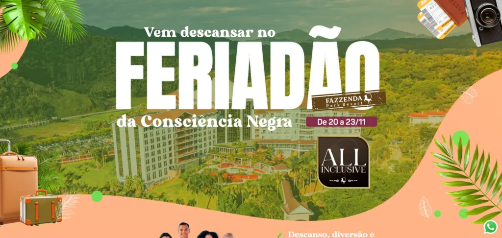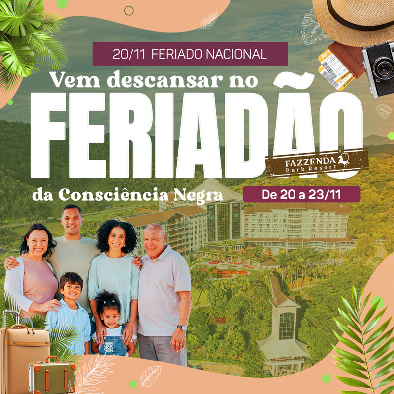 No Fazzenda Park Resort, de 20 a 23/11, o Feriado da Consciência Negra é All Inclusive com promoção exclusiva para reservas antecipadas.
